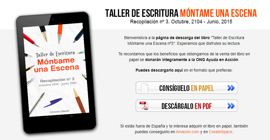 Mi participación en este caso puede ser encontrada en la misma pagina de Literáutas, en el post Libro del Taller de Escritura «Móntame una Escena» – Recopilación 2, compilación que se puede descargar en PDF y encontrar también en Amazon, donde las ganancias se derivarían íntegramente a una ONG llamada Ayuda en Acción.